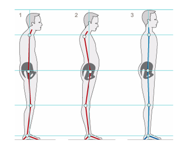 1 und 2: Körperstruktur nicht im Lot. 3: Körperstruktur im Lot bei optimaler Aufrichtung. Die Muskeln sind frei für Bewegungen.